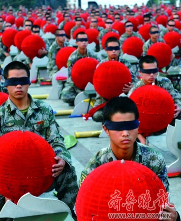 蒙眼訓練也要達到整齊劃一。郭建政 攝