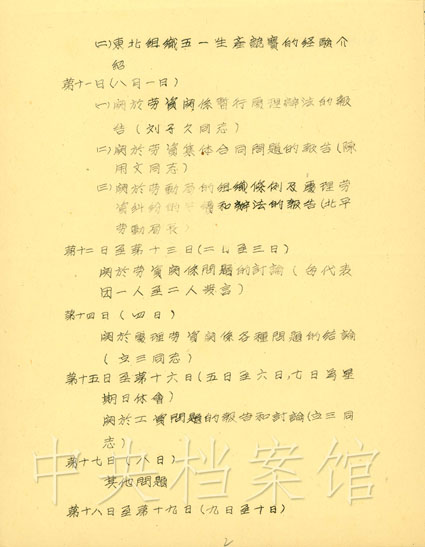 1949年7月23日至8月16日,全國工會工作會議在北平舉行。出席會議共有省、市、區72個單位的代表254名。毛澤東、朱德、周恩來等先后到會講話,李立三作了關于工會組織的報告。這次會議規定了當時全國工會工作的中心任務,就是在一年左右基本上把全國工人階級組織起來,以便在新中國的政權建設和經濟建設中勝利地擔負起領導階級的歷史使命。會議通過了《關于勞資關系暫行處理辦法》等四個文件,明確了在新民主主義政權下處理勞資關系的正確途徑。