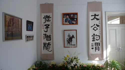 呂老遺像兩側,是散文家黃苗子先生寫一副對聯:“太公釣渭 老子猶龍”。呂彤林說:“父親 喜歡黃苗子的樸拙的書法,對姜太公和老子那種去留無意的境界很向往,對名利不以為意。”