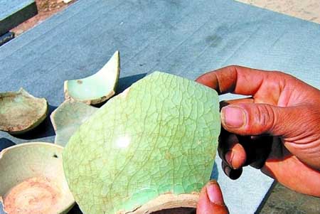 昨日上午,普查小組來到水庫,只見這里依山傍水,盛產高嶺土和釉水等礦產資源,具備燒制青瓷的條件。在水庫原儲水處發現了大量陶瓷片,堆積層厚達1至5米。普查組專家隨手拿起一件碎瓷,碗底有一個明顯的乳心。專家稱,這是明顯的元代青瓷特色。