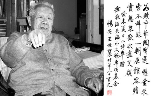 2002年搶救流失海外文物專項基金成立,邀請王世襄先生擔任顧問,他欣然應允。他說,被掠奪的文物,如龍門、云岡石窟被盜掘的文物,應該無償追回。這些文物必須歸還回原地,因為他們是土生土長的,根在國內,是上下相連的。王世襄先生對成立一個以搶救流失文物、保護文化遺產的公益組織頗感快慰。興奮之余他賦詩一首:為贖中華國寶還、懸金求索不辭艱。一朝展館容瞻賞,萬眾歡欣盡笑顏。