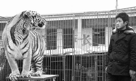 成熟的老虎僅有兩三歲兒童的智力,馴虎不能急于求成。胡敬才說,再好的馴虎人也需要數月的情感磨合,否則不可能和老虎建立“朋友關系”。為贏得老虎的“芳心”,馴虎人每天要和老虎在一起待六七個小時,每周要給老虎改善生活,豬肉、羊肉、牛肉等一應俱全,夏天每天中午還要給老虎“裸浴”一次,并經常為老虎梳理毛發;冬天要給老虎的籠子加蓋防凍布。