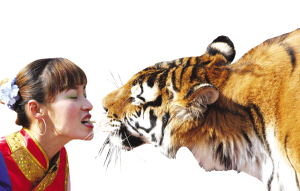 晁改敏被蘇州人熟悉,是在去年11月。那時,她所在的馬戲團與蘇州白象灣景區(qū)正式簽約,她和丈夫也告別了各地流動演出的生活,帶著英雄虎爸虎媽和它們的兩只虎寶寶,在蘇州暫時定居。白象灣景區(qū)開園的時候,晁改敏表演了叼肉喂虎節(jié)目,此前她曾因此節(jié)目,被譽為中國第一馴虎女郎。當(dāng)她叼著肉,老虎從她的嘴邊把肉吞下時,她的口與虎口近乎零距離。此后,游人多的時候,晁改敏總會表演這一節(jié)目,晁改敏也因此在蘇州名氣響亮。