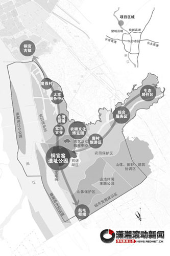 在T字型發展模式之下,遺址公園將形成“一縱”、“一橫”的經典布局。前者為一條綠色文化遺產廊道,包括銅官古鎮、度假村、太豐服務中心、山灣部落、覺華古寺、銅官窯遺址公園和航電樞紐,后者為一條特色文化旅游通道,包括生態居住區、綜合服務區、唐村旅游區和銅官窯遺址公園。