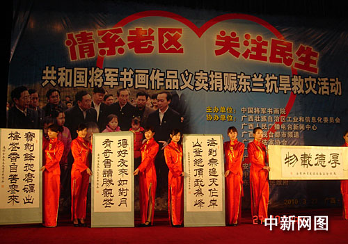 中新網南寧3月27日電(記者 羅先彬)2009年8月份以來,廣西革命老區(qū)東蘭縣境內持續(xù)干旱,人畜飲水困難,農業(yè)生產受影響嚴重。東蘭縣嚴重的旱情,牽動了一群遠在北京的共和國老將軍的心:中共第十二屆至第十五屆中央委員、原沈陽軍區(qū)、蘭州軍區(qū)司令員、軍事科學院院長劉精松上將,和其他八位老將軍,不顧年高體弱,千里迢迢趕赴南寧,獻出自己精心創(chuàng)作的114幅書畫作品進行慈善義賣,所得114萬元全部捐給東蘭人民,用于目前的抗旱救災。