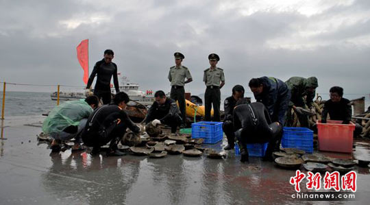 在打撈船上,還有一道獨特的亮麗風景,他們是廣東汕頭邊防支隊派駐“南天順”打撈船,對出水文物和考古專家實施安全警衛的邊防官兵。可以看到邊防官兵分成3個小組,其中一組負責水下文物出水區的警戒,一組負責文物沖洗區的警戒,一組負責在打撈船上的機動巡邏。另外,汕頭邊防支隊還派出1艘公安邊防巡邏艇和2艘摩托艇負責海上警戒,及時勸離不明船只靠近該海域,以免影響打撈工作。