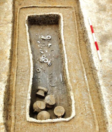 據(jù)介紹,今年3月初,浙江省文物考古研究所和余杭博物館聯(lián)合對(duì)玉架山遺址繼續(xù)進(jìn)行發(fā)掘、探索。本年度發(fā)掘至今,清理良渚文化墓葬32座(共200座);可能存在房址的東北角附近已著手發(fā)掘。依照計(jì)劃尋找遺址對(duì)外通道,解剖了環(huán)壕東北角向北延伸的部分(鉆探時(shí)推測為北通道),獲知解剖點(diǎn)的北通道寬約9.5米,深1.5米。在距北通道西側(cè)約30米處發(fā)現(xiàn)了另一小遺址,清理了一條東西向小溝(局部),在小溝的北岸壘有一些石塊,并發(fā)現(xiàn)了良渚文化晚期小墓墓地,暫時(shí)清理了其中一座。