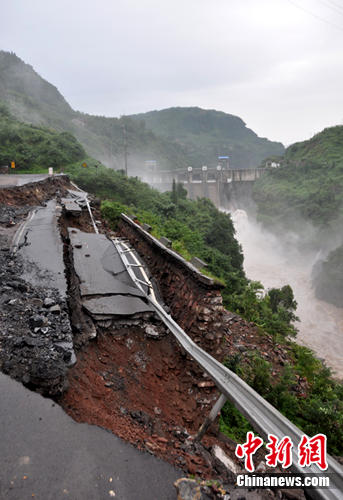 21日上午9時(shí),120米長的路基深陷深度已達(dá)4—5米,其中25米路基和道路內(nèi)側(cè)臨時(shí)車道也垮塌,滑坡同時(shí)還引起上行線路出現(xiàn)裂縫,國道108線交通已完全中斷。該路段位于花灘電站水庫大壩下方、滎河河道正上方,地勢陡峭,一旦出現(xiàn)大面積塌方,泥石將直接滾入河道,很可能形成堰塞湖,后果不堪設(shè)想。