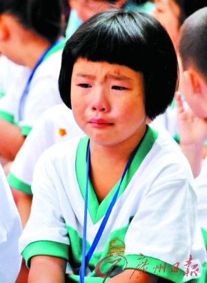 開學典禮剛進行20分鐘,一年(1)班一個已經哭得鼻子紅紅的小姑娘從自己的位置上站起來,走到老師面前,斷斷續續地說著什么。老師拍著她的肩膀說了幾句,小姑娘不情愿地坐回原位,豈料越哭越委屈,完全顧不上看臺上的表演。