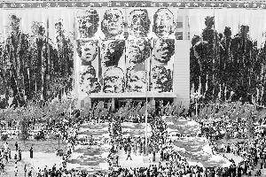 昨日,一場(chǎng)近萬(wàn)名師生參與的行為藝術(shù),在中州大學(xué)上演,千名大學(xué)生齊揮黑色炭筆,在白色巨幅上描繪出21幅民工“老萬(wàn)”頭像,每幅達(dá)50平方米。