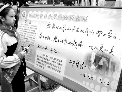 昨日,新村小學的學生在觀看胡錦濤總書記當年的題詞!⊥ㄓ崋T 田立平 樂鋼 攝