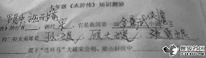 發(fā)帖者稱:最近在中學見習,趕上學校在考關于《水滸傳》文學常識的卷子。幫老師批卷子的時候,孩子們超級富有想象力的答案囧翻了我們一屋子人。