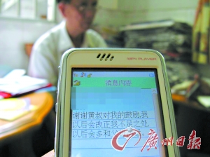 本報訊 (記者曾毅攝影報道) 今年74歲,曾任順德區人大代表的黃其廠老人,昨天終于等來了一條期盼多日的短信,“謝謝黃叔對我的鼓勵,我以后會改正我不足之處,以后多和父母溝通。”
