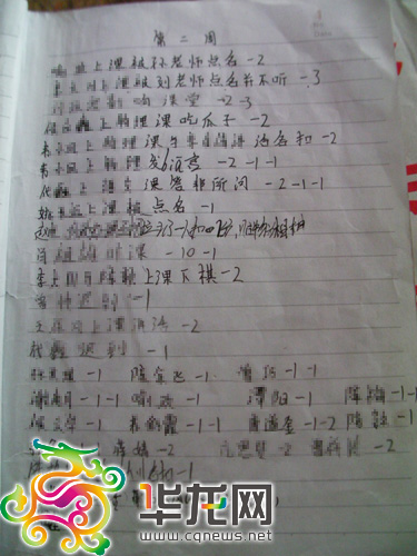 記者翻開其中一頁,看到的便是第2周班上同學的扣分情況,該情況詳細記錄了哪位同學因何事,而被扣了多少分。