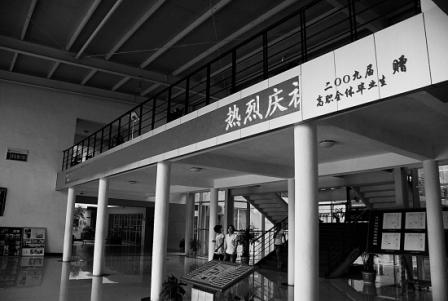 昨天下午,記者來到位于寧波市環(huán)城北路的教育學(xué)院。走進教學(xué)樓大廳,正上方鑲嵌著一塊大約十來米長,半米寬的電子顯示屏,屏幕的右邊則鑲嵌著 “二00九屆高職全體畢業(yè)生贈”的金字。