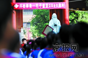 “拜,興,禮成!”今天是孔子誕辰2560周年紀念日,上午,孔廟舉行了傳統的拜師禮活動。國子監中學初一年級的160名學生在孔廟大成門舉行了拜師禮。