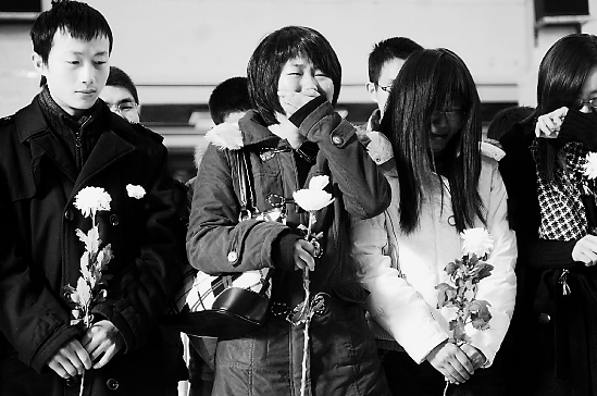 遺體告別儀式開始了。大家朝楊濟源三鞠躬后,紛紛獻上了白菊花,一直強忍著悲痛的楊媽媽再也支持不住了,好幾次沖到濟源身邊,想再摸摸兒子的臉龐。