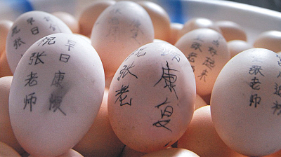 由于戴著口罩上課,張老師為讓學生們能夠聽清楚,經(jīng)常一句話要重復兩三遍,一堂課下來常常累得口干舌燥。即使是這樣,張小林仍然一直堅持著。看著張老師戴著“面具”上課,初二一班的同學們悄悄湊了130個雞蛋,每個雞蛋上都寫著:“張老師,祝你早日康復!”“張老師,快點好吧”……學生余南瀾說,在班干部提議下,同學們每人拿兩個雞蛋送給張老師,一是祝福他,二是希望能為他補充營養(yǎng)。