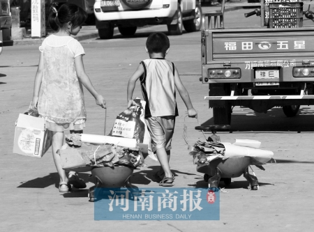 姐弟倆拉著童車(chē)賣(mài)廢品