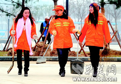 昨天中午,記者在武漢火車(chē)站東廣場(chǎng)看到,有三名年輕、漂亮的女孩,穿著橘紅色的環(huán)衛(wèi)工作服,和同事們一起作業(yè)。據(jù)介紹,這三名女孩都是“85后”的大學(xué)畢業(yè)生,于2009年12月25日前后應(yīng)聘上崗的,她們的名字分別是付莎莎(江漢大學(xué)衛(wèi)生技術(shù)學(xué)院畢業(yè))、羅瑛(長(zhǎng)江職業(yè)學(xué)院畢業(yè))、付琴菲(湖北藝術(shù)職業(yè)學(xué)院畢業(yè))。