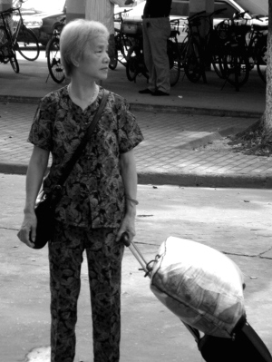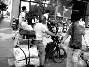 爺爺輩的送新族——一位頭發(fā)花白的老者騎著一輛電動車,車后綁滿了大大小小的包裹、箱子。一個女孩皺著眉頭對老者抱怨著什么。原來,女孩因為父母沒能陪同前來非常生氣,她向老人埋怨說,別人都有父母代辦手續(xù),而自己必須獨自排隊繳費。老人的銀發(fā)在風(fēng)中顯得零亂,額頭上滲出的汗珠在秋日的陽光里閃閃發(fā)亮。