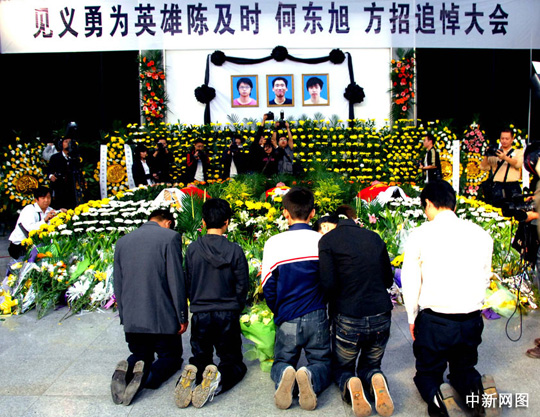 上午的追悼會由荊州市委副書記傅立民主持。長江大學黨委書記張忠家在悼詞中說,三名19歲的大學生為搶救他人生命,卻不幸離我們而去。我們為之悲痛,為之感動。陳及時、何東旭、方招同學舍己救人的事跡震撼了古城、感動了全國!幾天以來,學校師生和社會各界人士,以多種方式表達崇敬和哀思。他們的英雄壯舉是良好的家庭教育、學校教育、社會教育和自我教育的結果。