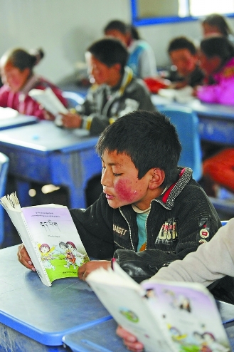 青海玉樹州孤兒學校的板房教室里,孩子們在大聲朗讀課文。 本報特派記者 王穎 攝