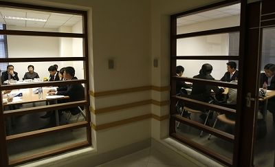 昨天中午,早報記者跟隨其中一個小組進入面試現場。面試室有3位考官,2位是復旦老師,1位是資深企業校友。參加面試的6位考生針對案例進行20分鐘的討論,然后每個人再用英文總結。