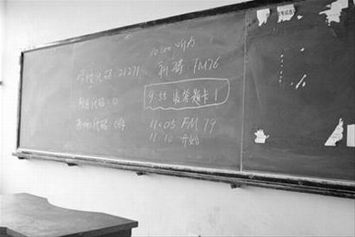 記者在第二教學樓208教室的黑板上看到兩個顏色書寫的內容,白色粉筆寫著“聽力10:00 FM76”,黃色粉筆寫著“11:05 FM79”。