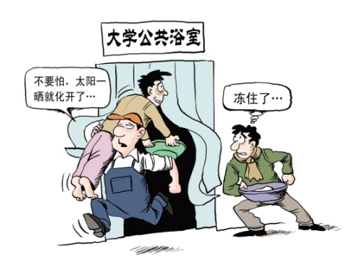本月21日,在汕頭金山中學南校就讀高二的小丹回市區度周末,一回到家中,她就迫不及待地沖進浴室,痛痛快快地洗了個真正意義上的熱水澡,學校里那半冷不熱的水讓她實在難以忍受。在幾天前最寒冷的那一天,小丹和同學們在公共澡房內刷卡等了半天,卻盛了一桶冷水,后來聽說是因為天氣太冷,供水管里的水都讓凍得幾乎結冰,水龍頭里流出來的都是冷水。沒辦法,小丹只好到開水房裝了一壺開水,摻進桶里混成溫水,打著哆嗦勉強洗完澡。