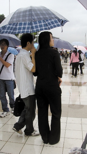 “好煩,早知道下雨就不來了,討厭!”為給面試官好印象,女大學(xué)生丹丹特地選了一套淺色條紋的套裝。但恰逢招聘會(huì)當(dāng)天是下雨天,丹丹的小套裝一下就粘上了點(diǎn)點(diǎn)雨花。丹丹一邊整理,一邊對身旁負(fù)責(zé)撐傘的男友撒嬌,而男友則不厭其煩地細(xì)語安慰:“忍一下就好,快到你了……”
