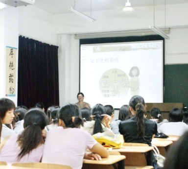 昨晚7點(diǎn),在該校一間可容納90人的大教室里已坐滿了女生,有的正認(rèn)真做著筆記,有的與同伴小聲交談著。講臺(tái)上,女教師在介紹該課的主要內(nèi)容,包括女子生殖系統(tǒng)、避孕、婦科病等知識(shí)。