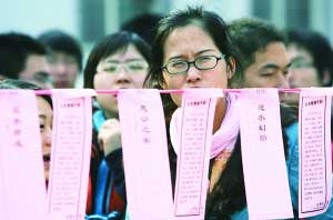 人大信息技術學院的李同學在一條“比干緣何落馬死,勾踐因此可吞吳”的謎語前苦思冥想。他說,對于學理工科的學生來說,猜字謎更容易些,在成語和典故這樣的謎語前有難度。