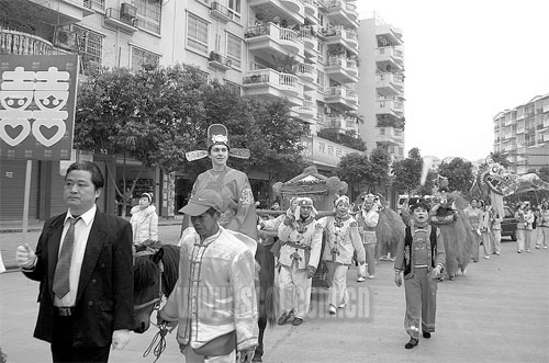 23日上午,數十名身著中國傳統服飾的婚禮隊伍早早等在西河北路一宿舍小區。十多名男女扛著木牌,上寫“鐘愛一生”、“喜結良緣”之類吉辭。兩只彩獅,一條長龍,排在隊伍當中。而近20輛人力三輪車,載著新郎、新娘的親屬,跟隨在隊伍后面。