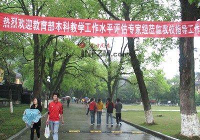 各種迎評的紅幅掛在教學(xué)樓或者人行道上,每幢教學(xué)樓門口都豎著倒計時牌,標記著這是評估前的最后一天。學(xué)生會成員站在教學(xué)樓門口檢查校徽。校園110們穿著嶄新的保安制服,騎著摩托車在四處巡邏,據(jù)說為了迎評,添置了不少人手。隨便找個什么人聊天,開口閉口談的都是“評估”。連和校內(nèi)的小店老板攀談,他也在說評估:“對面那家店,是為了迎評新開的……”