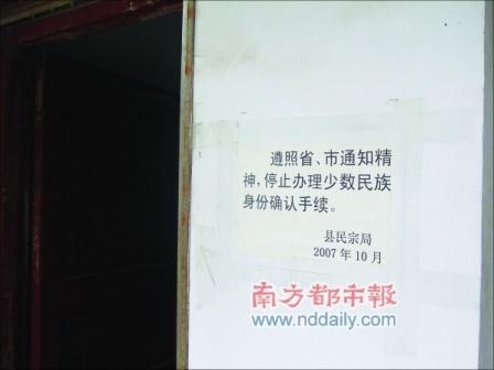 在民宗局辦公室的門口處,張貼著落款為“2007年10月”的一份告示,“遵照省、市通知精神,停止辦理少數民族身份確認手續!迸砹f,這是因為找她們辦民族變更手續的人很多,“很煩,就在門口貼了這張公告!