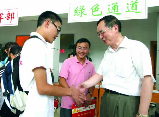 正在王德鑫和王剛填寫表格的過程中,中科大校長朱清時院士來到了他們身邊,“歡迎你們來到中科大!”校長向他們伸出了溫暖的大手。聽說王德鑫和王剛早早就立志考科大,朱校長高興地說,“我也是四川人,也是早早立志考科大,我是1963年考上的,到現在45年了。”在了解到王德鑫是一個人來報到時,朱校長連聲夸贊他“了不起”,“現在一個人來報到的學生可不多了,當年,我們都是一個人來學校的!”在向兩位同學簡單介紹了“綠色通道”的報名程序后,校長再次祝福他們:“祝愿你們在中科大的生活和學習一切順利!”
