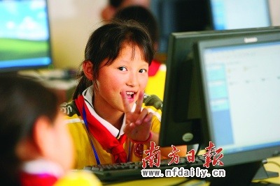 一名學生在上電腦課時,調皮地沖著記者做手勢。