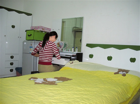 10平方米的屋子擺放著一張雕花大床、全套粉紅色電腦桌、梳妝臺和衣柜,空調(diào)、冰箱和電飯煲等生活家電齊備,墻壁上花狀壁燈和各式各樣裝飾品仿佛透露了這間房的“主人家”是個(gè)年齡不大的姑娘……如果不是從四川某高校女生宿舍樓大門進(jìn)來,記者都不敢確定應(yīng)該用“學(xué)生宿舍”還是“賓館套房”為這間屋子定名。