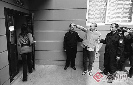 王同學被押回小區指認偷盜現場。 江洋 攝