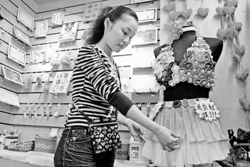 “安全套有招財保平安的作用。”營業員胡小姐稱,這些安全套飾品價格從十幾元到幾十元不等,開業初,顧客以為是情趣店,不敢進來,后來掛出飾品的招牌才使得顧客慢慢接受,經常來光顧的大部分是90后。她還稱,全國很多城市都有安全套首飾店,生意很火爆。昨日(10月23日),記者通過電話聯系到首飾店老板,對方稱,制作飾品的安全套全部都是中國臺灣和日本生產的。
