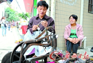 補(bǔ)鞋攤位與房子一街之隔,一張木凳,一臺(tái)機(jī)車,一個(gè)木制工具箱,這就是劉建文的謀生家當(dāng)。如今,年輕的夫婦倆每天坐在街上,妻子幫著拿東西,丈夫忙著修修補(bǔ)補(bǔ),一雙鞋3元錢,一把雨傘2元錢。“現(xiàn)在干這行的人多了,一天賺個(gè)40元已經(jīng)很不錯(cuò)。”建文不無(wú)憂慮地表示,“房租230元,兩個(gè)人只有幾百元生活費(fèi),挺難的。”
