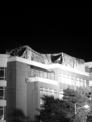 昨夜10時,記者趕到中國農業大學東校區南門。走到教學區內,樓間的空氣中彌漫著大量的濃煙。此時,食品科學與營養工程學院教學樓周圍50米范圍都拉起了警戒線,十余輛消防車警燈齊閃,數十名消防隊員正拖著水管緊急向樓頂噴灑著水柱。該教學樓高五層,樓頂處的火光依稀可見。至晚10時10分,明火被撲滅,大火將頂層建筑部分燒得歪歪斜斜,濃煙在夜空中形成了一道煙柱。