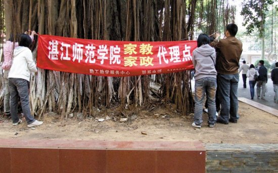 據了解,湛江師范學院勤工助學服務中心設有家政部和熱線電話,從周一至周日每天上午到下午,都有學生干部義務接聽電話,為雇主提供服務。而校外也有企業打出“大學生家政服務”牌子招攬業務。不過,學校與企業的目的不同,前者是為了幫助困難大學生渡過難關,而后者則是以贏利為目的。