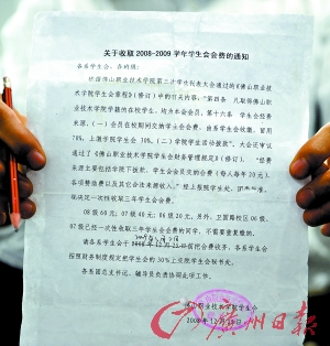 記者從該學校學生會2008年12月15日下發的一份蓋有公章的《關于收取2008~2009學年學生會會費的通知》上看到,收取會費的根據是佛山職業技術學院第三次學生代表大會通過的《佛山職業技術學院學生會章程》(修改)中的有關內容,“凡取得佛山職業技術學院學籍的在校學生,均為本會會員”、“學生會經費來源,會員在校期間交納學生會會費(每人每年20 元),由系學生會收繳,留用70%,上繳學院學生會30%。”