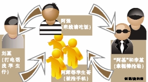 據嫌疑人交代,3月8日,一個花名叫“阿基”的男子找到阿強,讓阿強想辦法找幾個學生出來,伺機搶劫他們的財物。阿強因最近手中缺錢,就一口應承下來,并找到平時在外面玩時認識的19歲的廣西人劉某,以請吃飯為名讓劉某帶些“學生仔”出來。