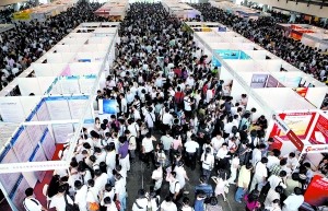 據介紹,此次共吸引了600多家用人單位參展,提供了5000余個職位,主要涉及工程技術、電子、銷售、人力資源以及制造業等。其中,不乏中國人壽、百盛、北大青鳥、聯想、百度、大中等知名企業。在舉行招聘會的國展2、3、4號館里,應聘者人頭攢動,水泄不通,主辦方為了保證三個展館內的正常運行還進行了暫時的人流控制和疏導。截至昨天11時,招聘會已吸引了近2萬名求職者。