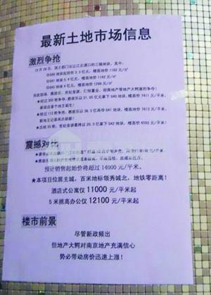 有意思的是,開發商臨時貼出了一張“最新土地市場信息”的公告,先說了土地拍賣的“激烈爭搶”和“震撼對比”兩部分內容后,給出了“樓市前景”——“盡管新政頻出,但地產大鱷對南京地產充滿信心,勢必帶動房價迅速上漲!”一些購房人看到后忿忿不平:這不是明擺著和政府的調控政策“叫板”嗎?開發商也太牛了吧!