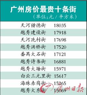 從廣州市各街道一手住房備案均價情況表可以看到,廣州樓價最高的10條街的均價起價是1.5萬元/平方米,最高的為天河獵德街均價為18035元/平方米。