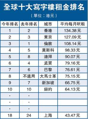 報告顯示,香港核心區域寫字樓平均尺租為134.38港元。另外,報告還顯示,上海以43.47港元的尺租排名第十八位。